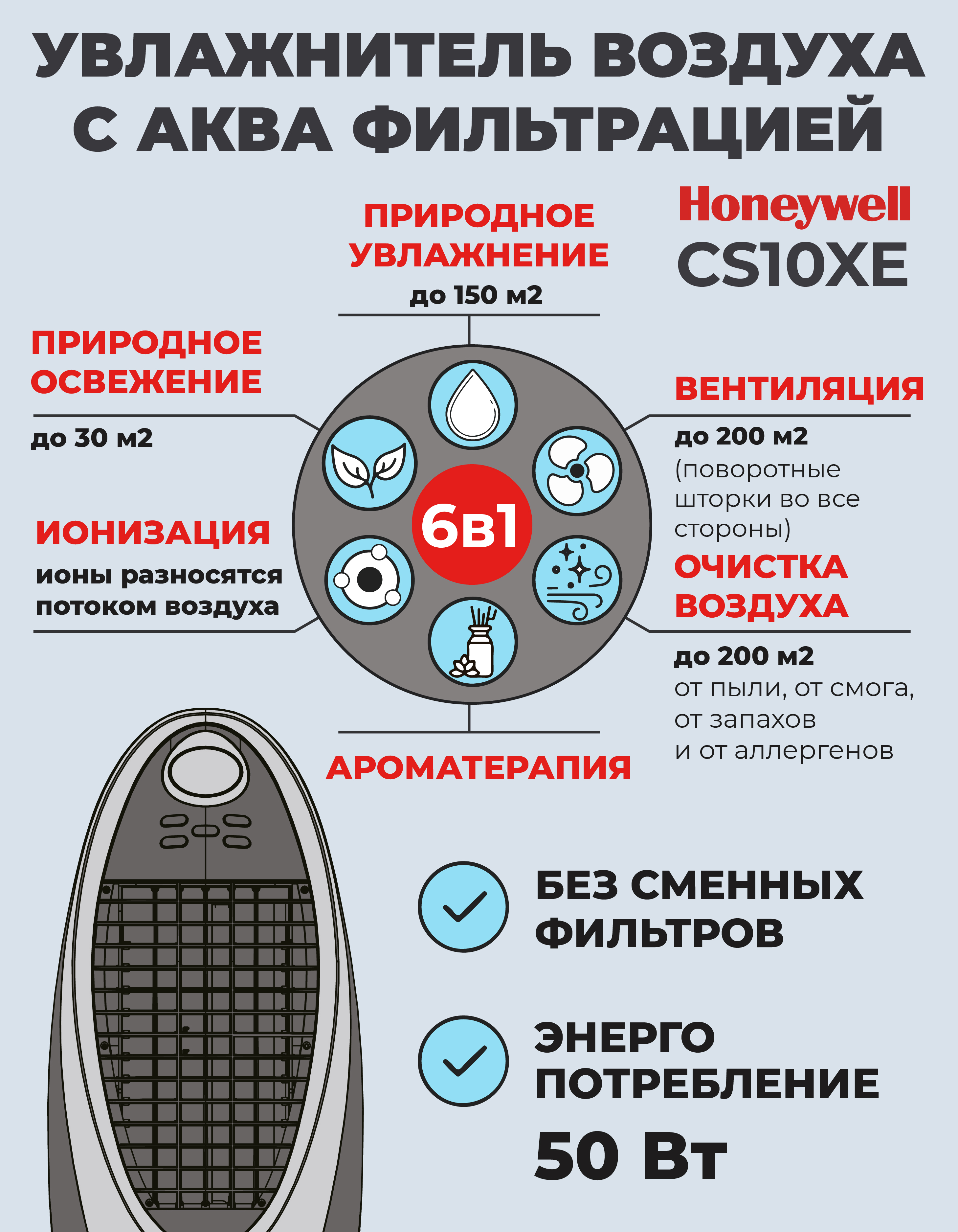 Климатический комплекс Honeywell CS10XE с ионизацией - шедеврального дизайна будущего, с аква фильтрацией и вентиляцией всего окружающего пространства, с ионизацией и большим съёмным баком для воды на 10 литров, с производительностью 510 м3/час. Honeywell cs10xe для комфортного увлажнения воздуха, очистки от пыли, пыльцы и микробов, с вентиляцией всего пространства, с полным циклом аква-фильтрации. Рекомендуемая площадь помещения до 150 м2. Работа прибора по принципу традиционного " холодного увлажнения " с обязательной сотовой фильтрацией (полное омывание всего проходящего воздуха). Достоинством прибора можно выделить: